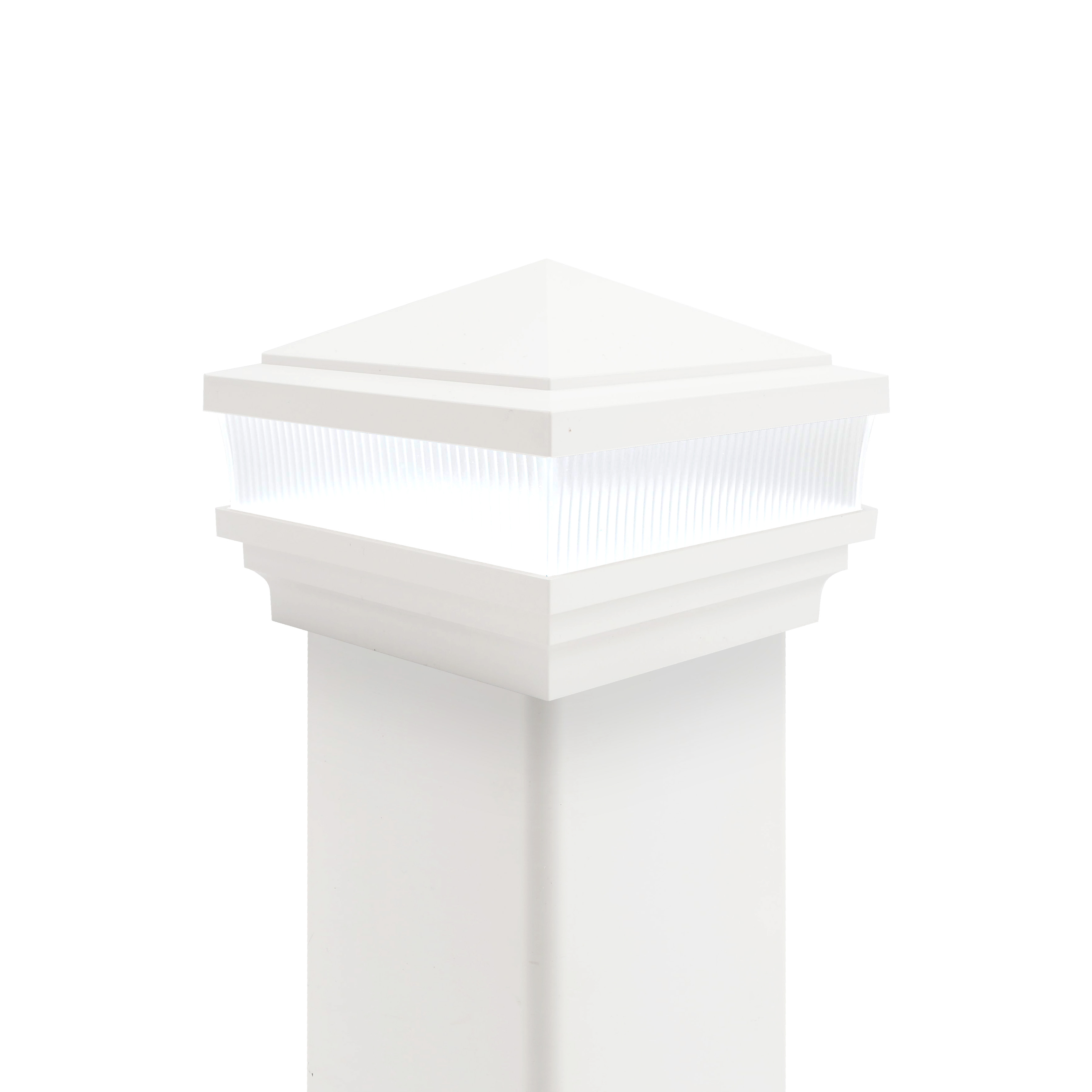 Enhance your outdoor living with this low-voltage post cap in white, designed in a Haven style, made to fit 4" posts. These caps are ideal to improve the appearance of vinyl fence and vinyl railing with long-lasting quality and easy installation. Being a low-voltage post cap, these decorative components light up after dark with wired connections that are guaranteed to maintain maximum brightness and longevity.