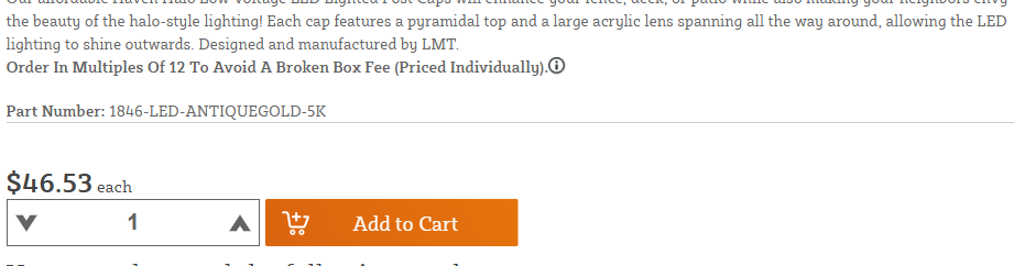 Above the purchase box in which options including size, color, lighting, and quantity can be changed by the customer, a clause is displayed to signify a Broken Box Eligible Product (i.e.): Order In Multiples Of [X] To Avoid A Broken Box Fee.